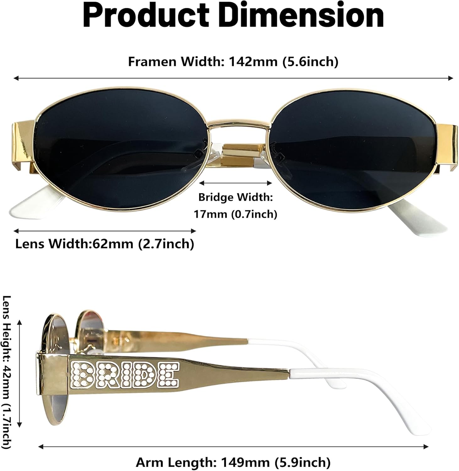 - Bide to Be: Featuring a delicate "BRIDE" logo on the temples, beautifully embellished with small lustrous pearls.This refined deatail adds a romantic,luxurious touch to bridal look,making it a perfect accessory for the bride and her bridal party.