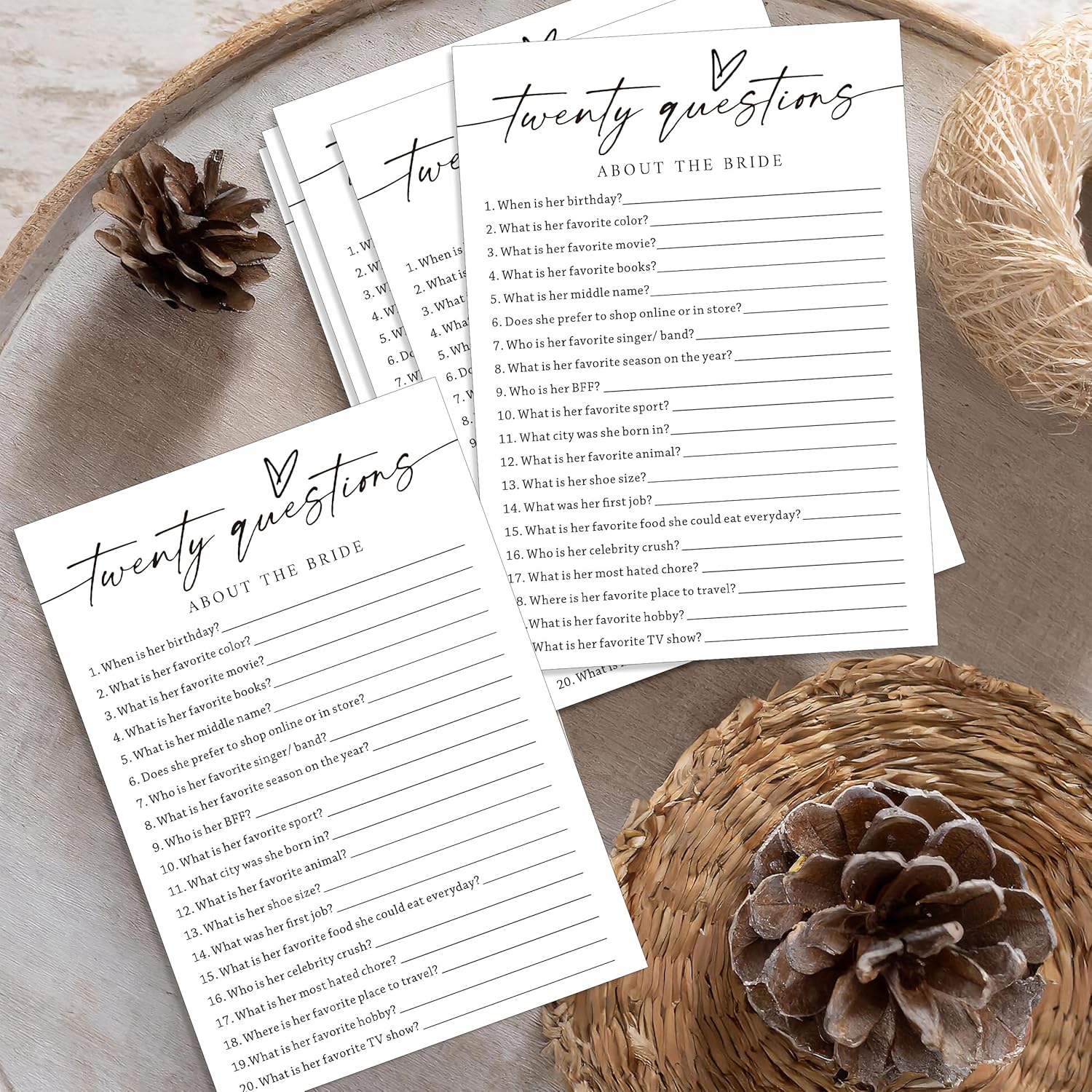 Fun Wedding Shower Games Cards, Twenty Questions About The Bride, Bridal Party Game and Favors for 25 Guests, Bridal Shower Decorations, Minimalist White Wedding Party Supplies - A07