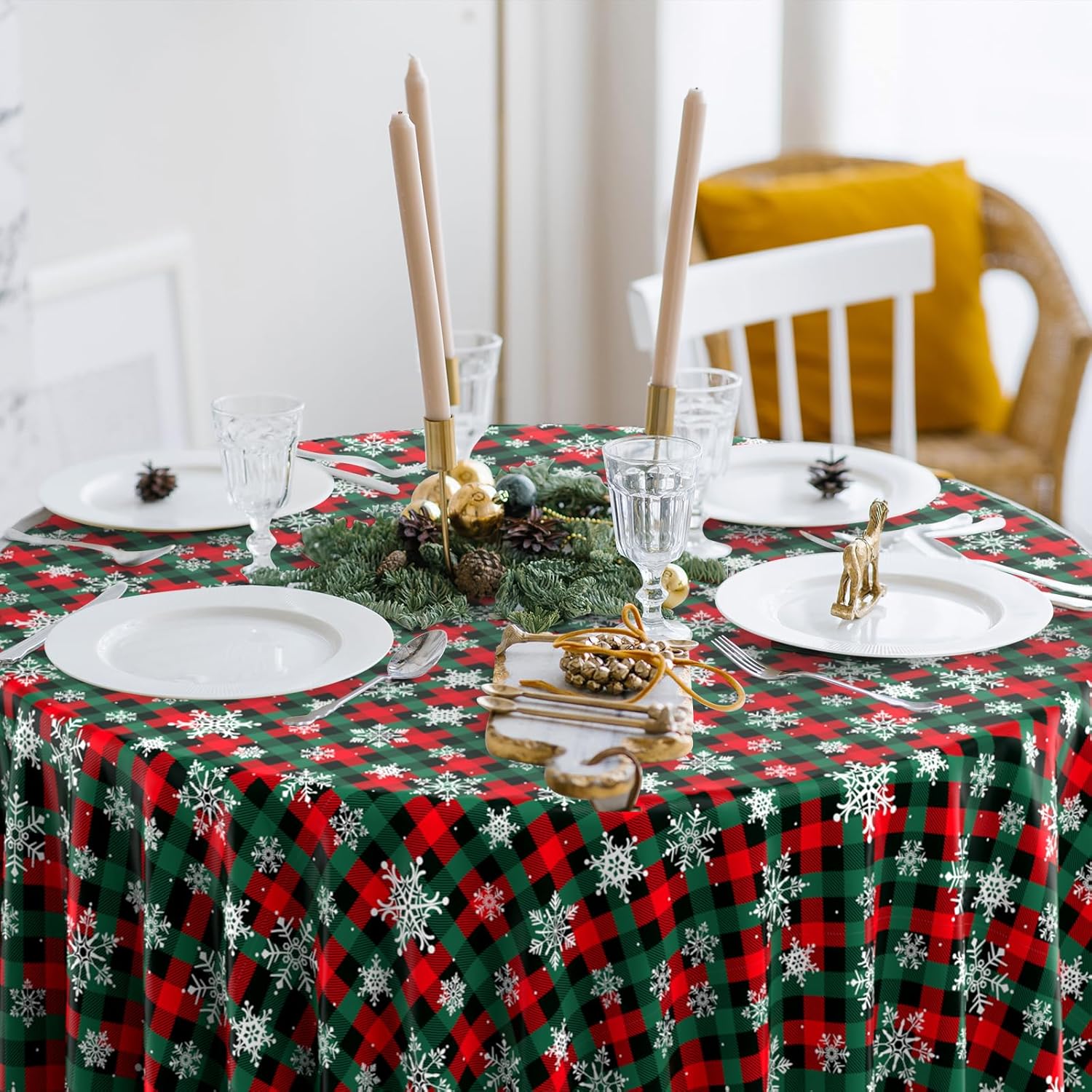 - Easy to clean: the white snowflake Christmas table cover with red and green buffalo plaid background has a smooth surface, you just need to wipe the table cover to clean it, then store it for next time or just toss it away,itโs great value for saving your time for cleaning after parties or decorate during the parties