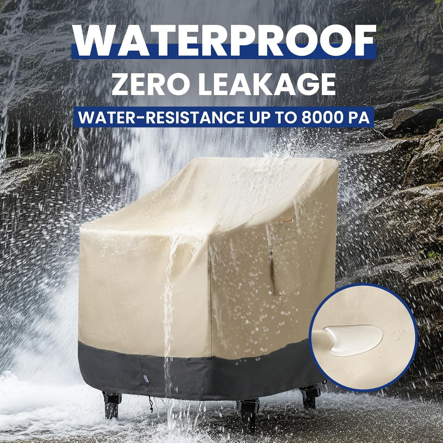 - 【ALL WEATHER PROTECTIO】This outdoor chair covers for patio furniture won't budge in storms thanks to the elastic hem cord with toggles and adjustable belted hem with click-close straps in the bottom. We also adopt better materials to increase buckle robustness and the strap thickness to provide extra security. Shields furniture from rain and sun while making neighbors ask: "Where'd you get that cover?"