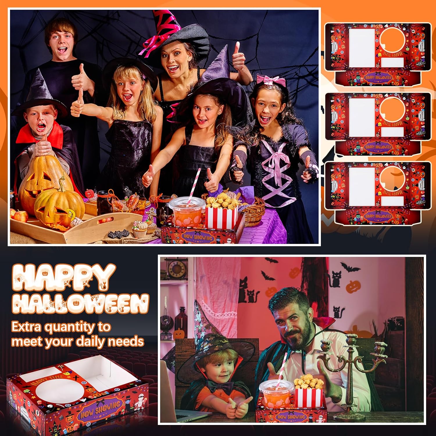 - Halloween Design: the Halloween movie trays for movie night are full of movie related elements such as pumpkin, ghost, cat, film reels, fries, chips and many other Halloween movies themed motifs to make them fit the theme of the movie, and make your movie going experience more comfortable