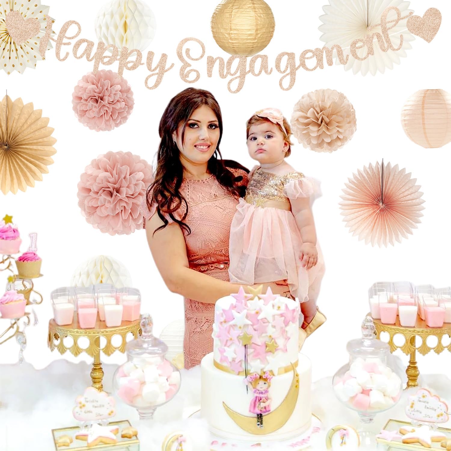 - 【Champagne Gold Beige Blush Pink Party Decorations kits】This kits include 1pcs Happy Engagement banner, 1pcs circle dots paper banner, 4pcs tissue flower pom poms: 3pcs 8" and 1pcs 12" , 2pcs 8inch paper honeycom ball, 3pcs 8inch paper lantern, 4pcs paper fan: 2pcs 12" and 2pcs 16", 6pcs Paper swirls hanging streamers