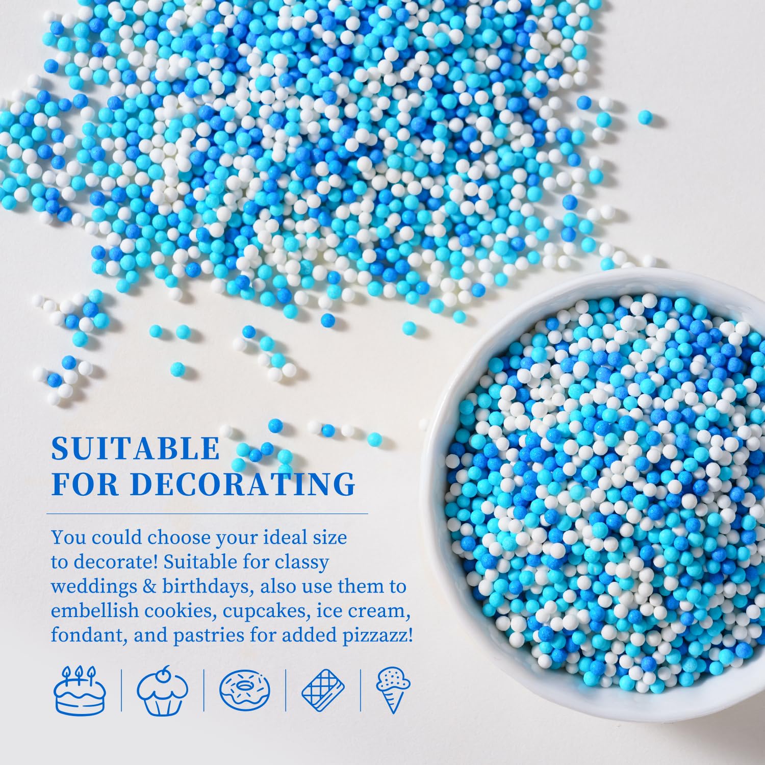 - High Quality and Safe: Made with food-grade ingredients. Edible, Nut-free, Dairy-free, Non-GMO. Our blue and white pearl sprinkles(2mm) meet American food standards and guard your and your family's health