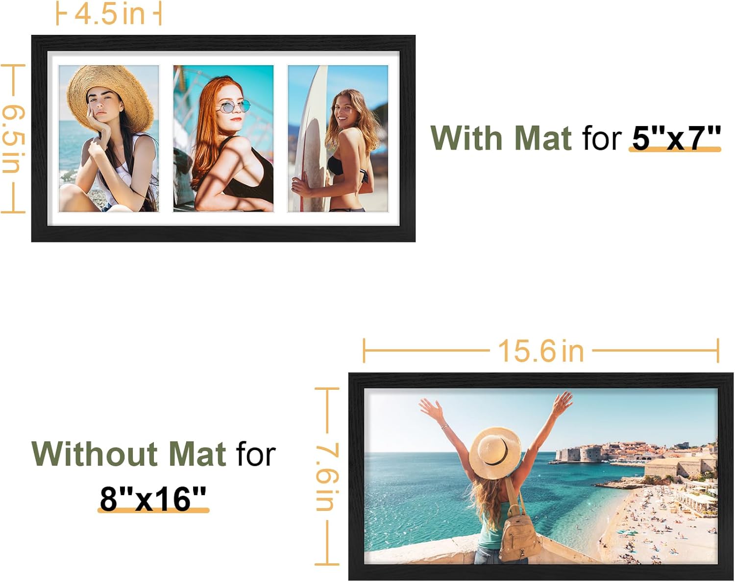 Vittanly 8x16 Collage Picture Frame, Displays 3Pcs 5x7 Pictures with Mat, Picture Frames Collage Wall Decor for Horizontal or Vertical Display, Black, 1 Pack