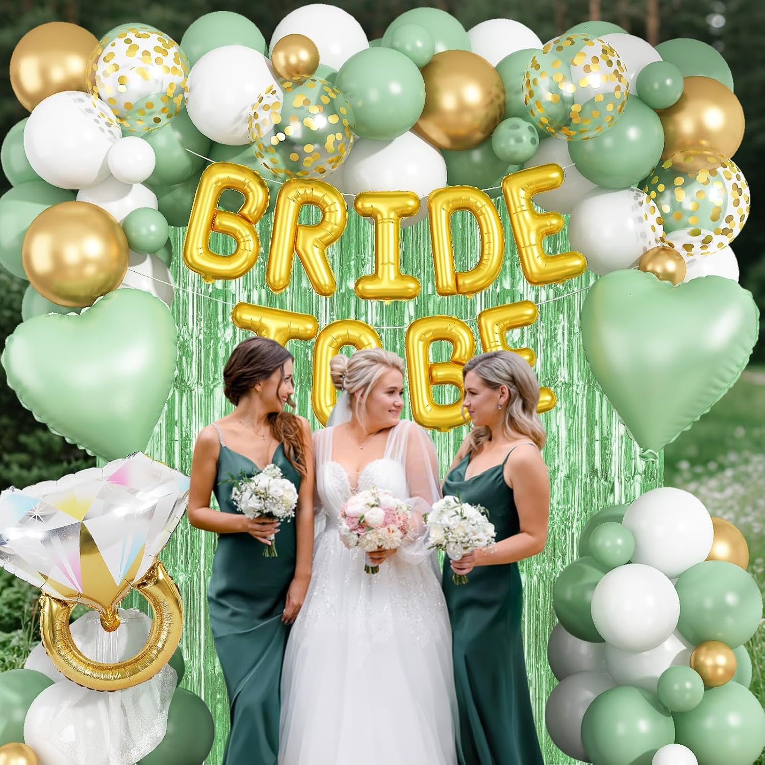 - Sage Green Bachelorette Party Decorations: These bachelorette accessories for bride include 1pc 16" gold BRIDE TO BE foil balloon, 2pcs sage green fringe curtains, 2pcs 18" heart balloons, 1pc cake topper, 1pc color hearts banner, 12" sage green/gold/white/gold confetti balloons(18pcs), 5" sage green/gold/white white balloons(9pcs) and 3pcs balloon tools—perfect for bridal celebration setups.