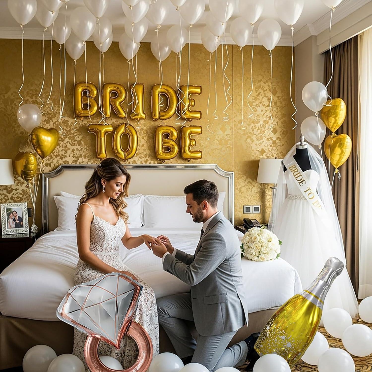 - Complete Bridal Glamour: All-in-One Celebration! This kit provides everything to create a fully coordinated and glamorous bridal theme. Beyond the elegant balloons, you get prominent gold "BRIDE TO BE" foil letters, romantic gold heart-shaped foil balloons, celebratory champagne bottle foil balloons, an impressive diamond ring foil balloon, a beautiful veil, and a chic sash. This ensures a cohesive and immersive setting for capturing those precious pre-wedding memories.