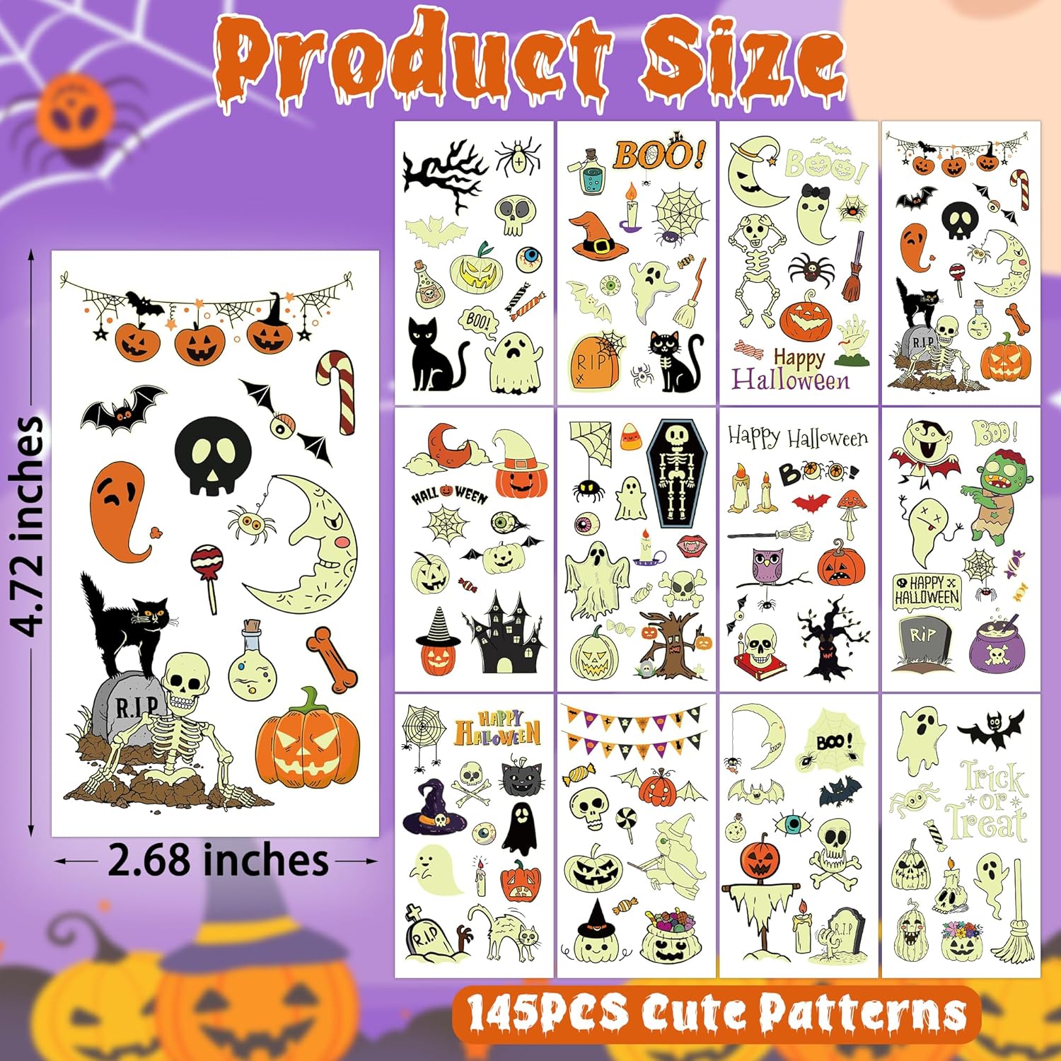 145 Styles Halloween Tattoos for Kids, 12PCS Halloween Luminous Tattoos, Glow in Dark Ghosts Pumpkin Fake Temporary Tattoos Stickers Bulk for Trick or Treat Party Decorations Accessories Supplies