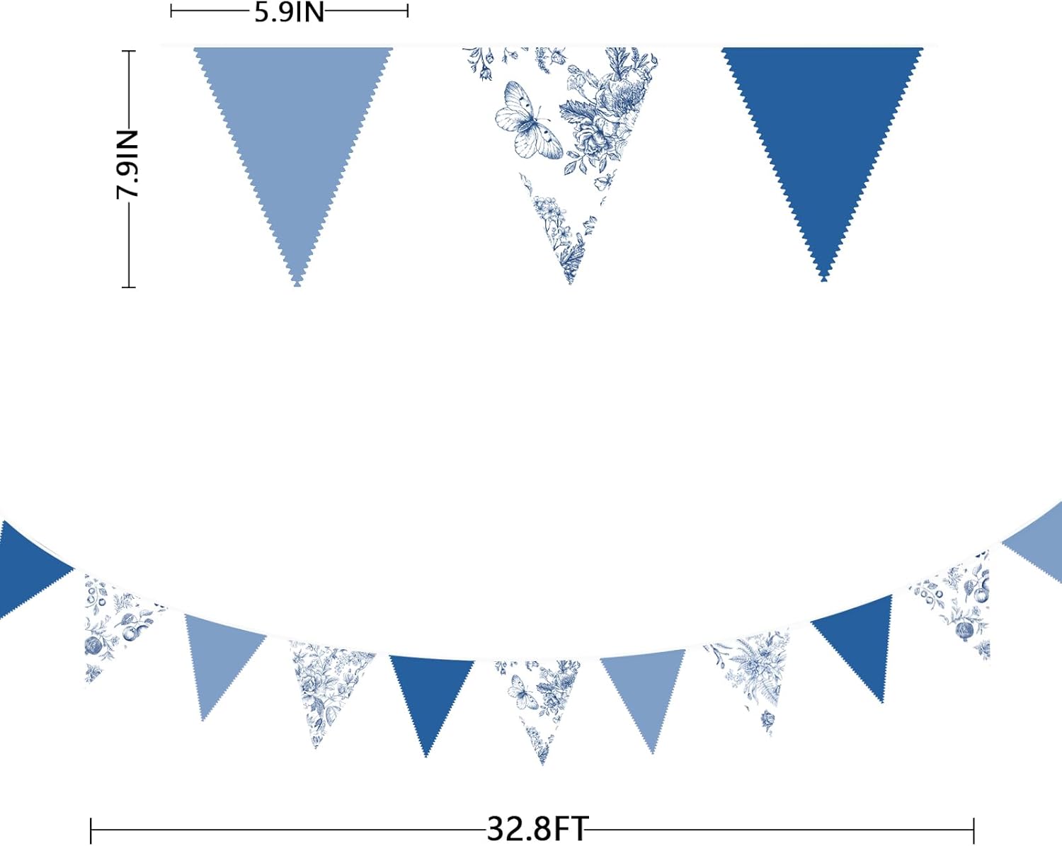 - Package Including:1 pack blue white vintage floral fabric bunting banner garland in deep blue, blue and vintage blue porcelain elements print colors, with 36pcs flags in 10M/32.8Feet. Flag Size: 5.5in width x 7in height.