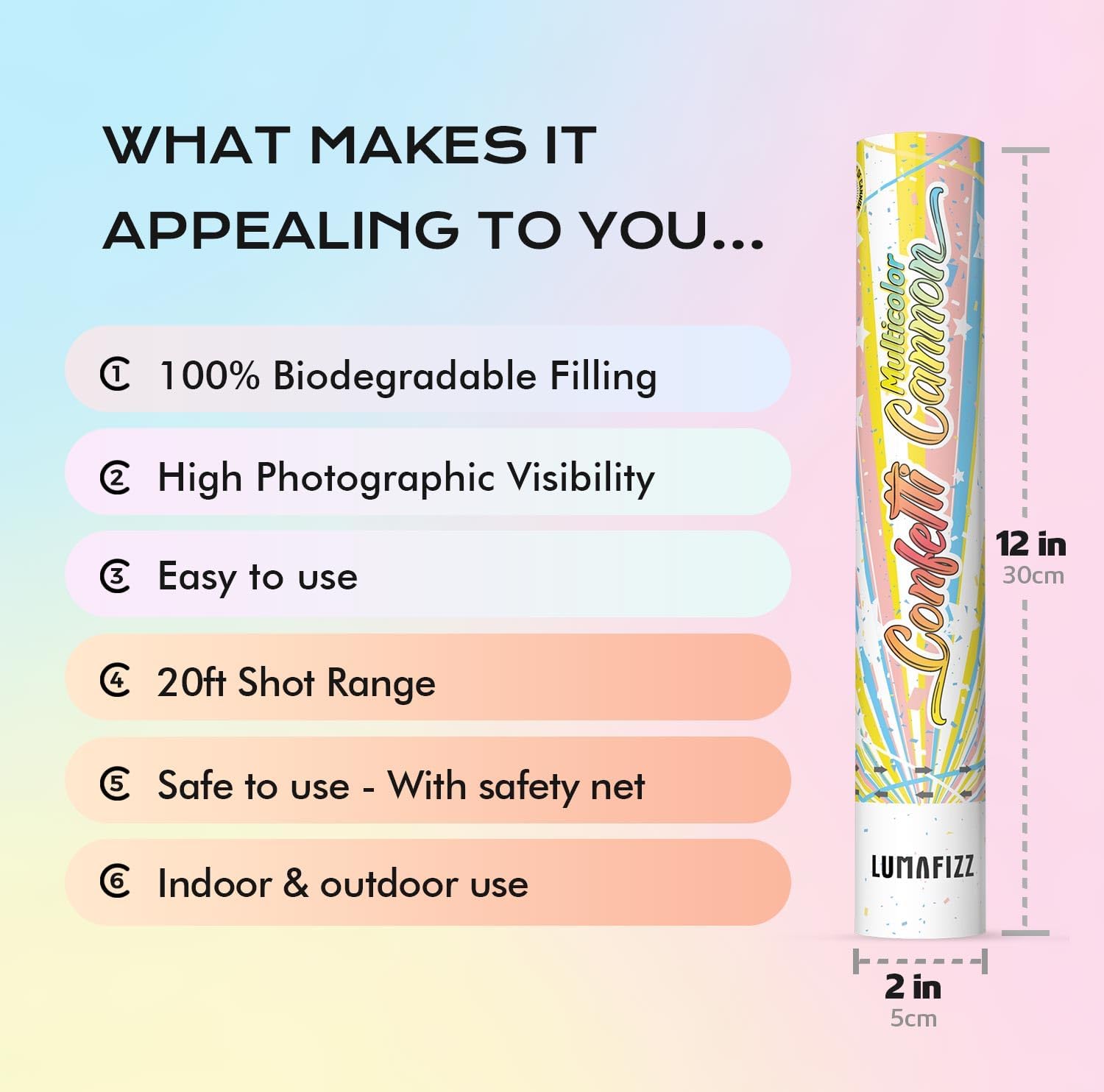 - 【EARTH-FRIENDLY CONFETTI】Love the planet while your Confetti Cannon lights up the sky. Every Confetti flutter is premium, dye-rich paper—100% biodegradable. Wind, rain, sunshine will guide it home, typically breaking down in weeks (Mother Nature’s encore, not a vanishing act). Celebrate bold with your Confetti Cannon, leave nothing but memories.