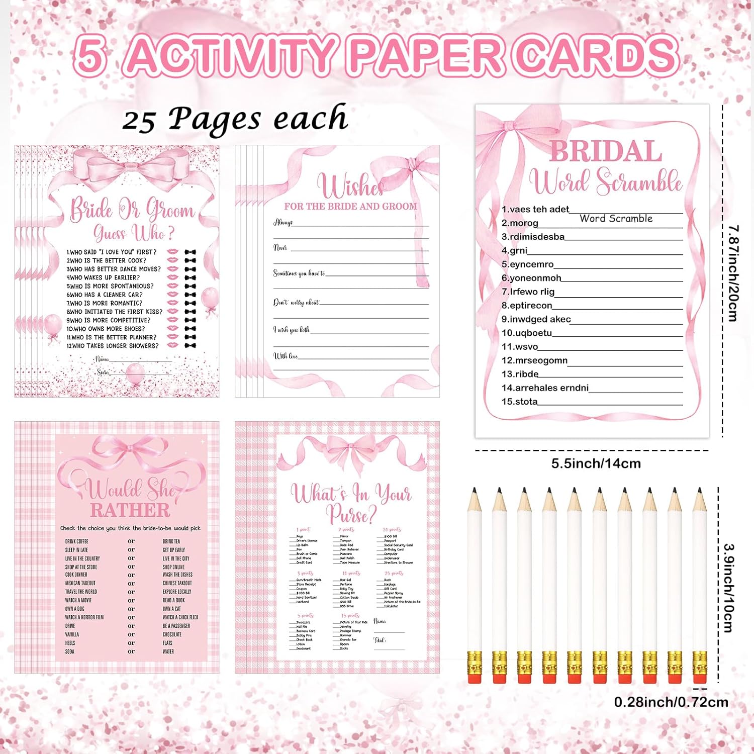 - Bridal Shower Game Kit: you will receive a total of 125 pieces of game wedding shower cards introducing 5 activities (25 each), and 20 pieces of pencils, adequate to meet your wedding shower party favor requirement; Get ready to have fun and laughter at your wedding reception with these bridal shower games