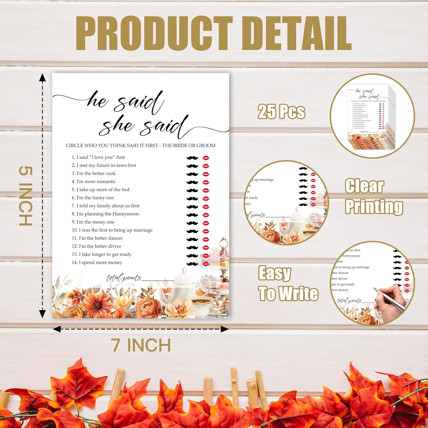 Fall Bridal Shower Games Cards, He Said She Said Wedding Bachelorette Party Games, Fall in Love Bridal Shower Decorations, 25 Cards, G03