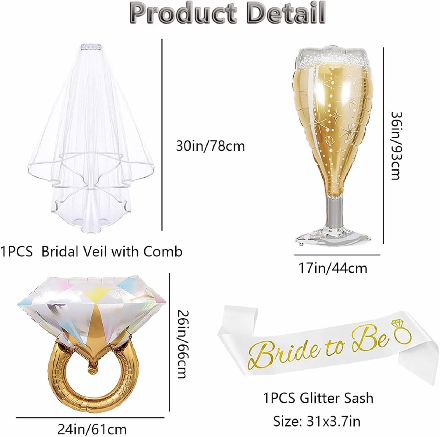 - 【Bridal Shower Set】You will receive: 1 x bride to be satin sash(31.5in), 1x layer veil(30in), 1 x diamond ring foil balloons(26x24in), 1 x champagne glass foil balloons(36x17in). This bridal shower set will be the most beautiful accessory for bride to be and the most thoughtful gift for her