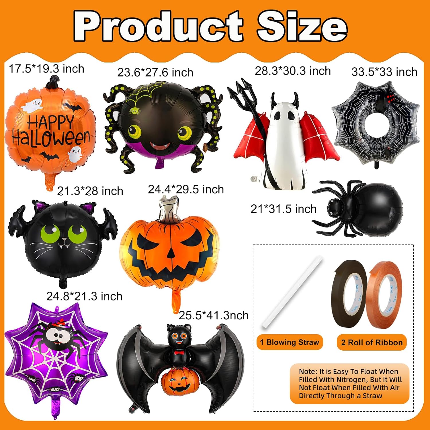 - Complete 9-Piece Halloween Balloon Set for Spooky Decor: Includes premium foil balloons (spider, pumpkin, bat & ghost) to create instant Halloween atmosphere; perfect for haunted houses, trick-or-treat setups, and party backdrops