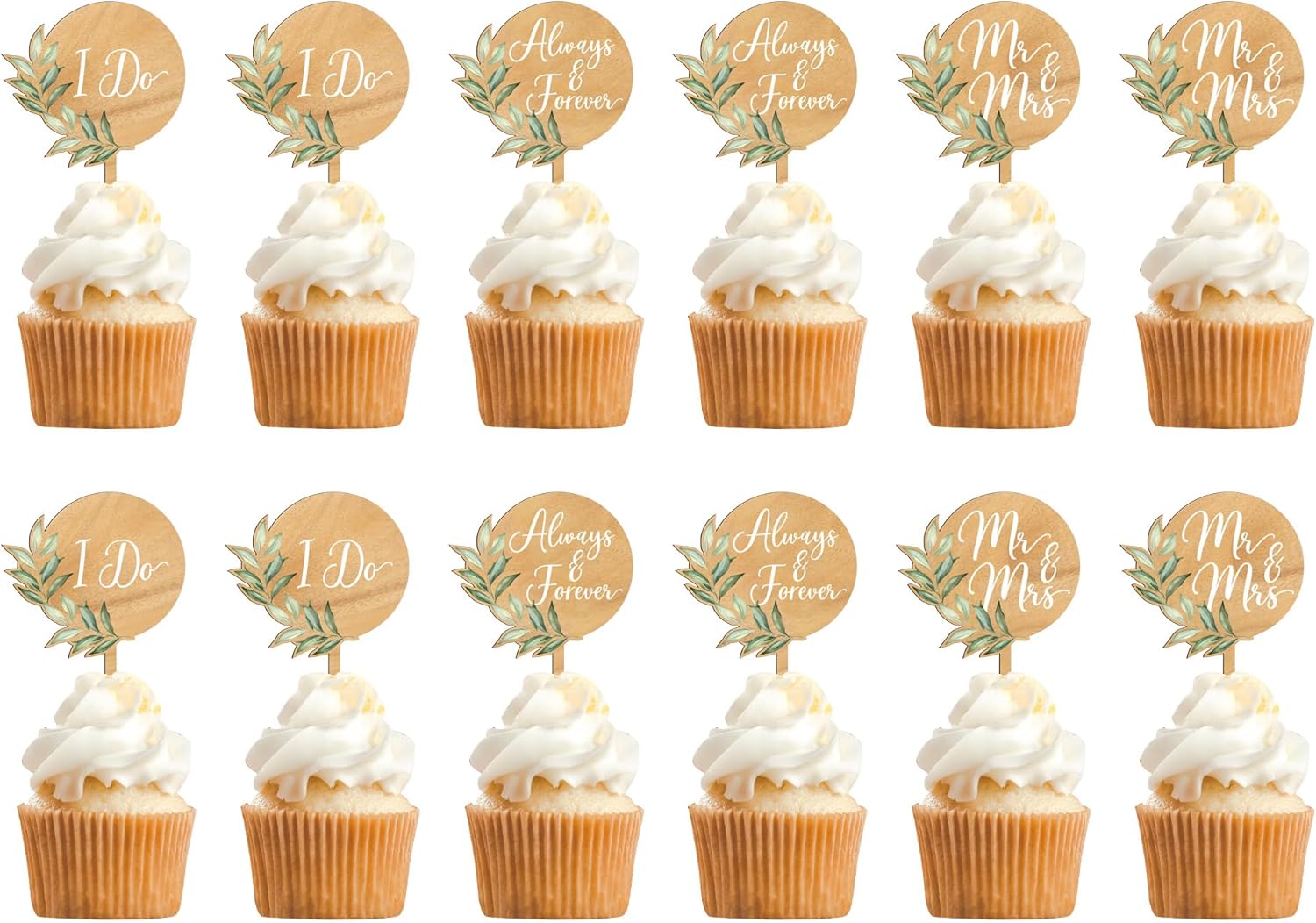 12 PCS Mr & Mrs Wedding Cupcake Toppers with Green Leaves Engagement Cake Decorations