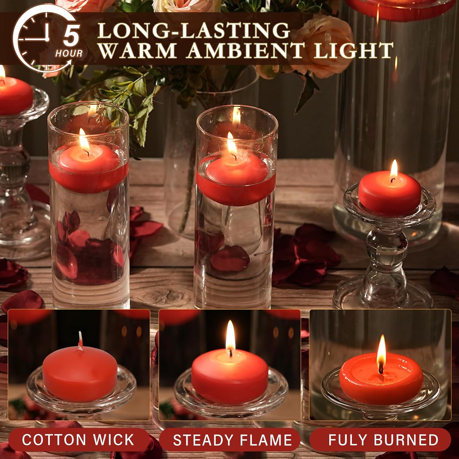 - 【CLASSIC RED FLOATING CANDLES FOR CENTERPIECES】Features 2 inch diameter floating candles, the ideal size for most vases and bowls. The vibrant red color adds a warm, romantic, or festive ambiance to any setting, making it perfect for wedding centerpieces, romantic dinners, or holiday decorations