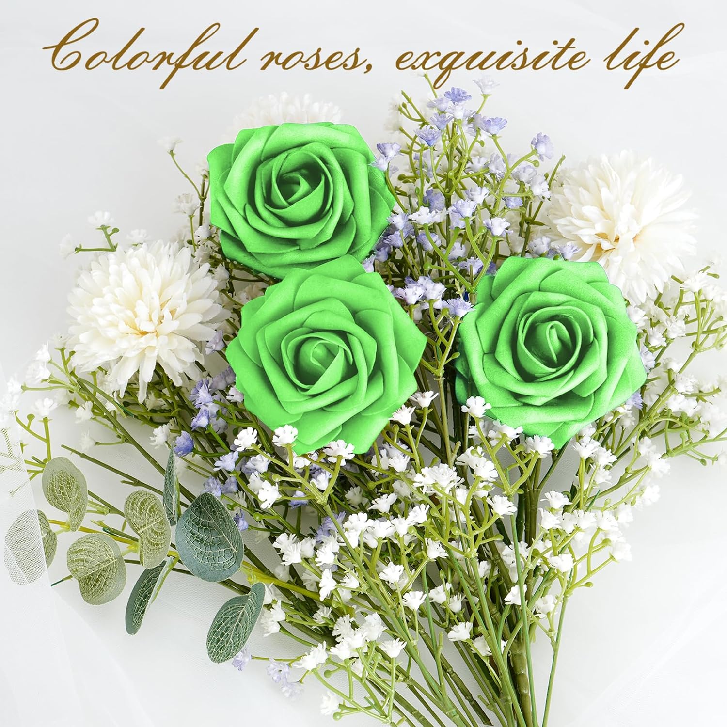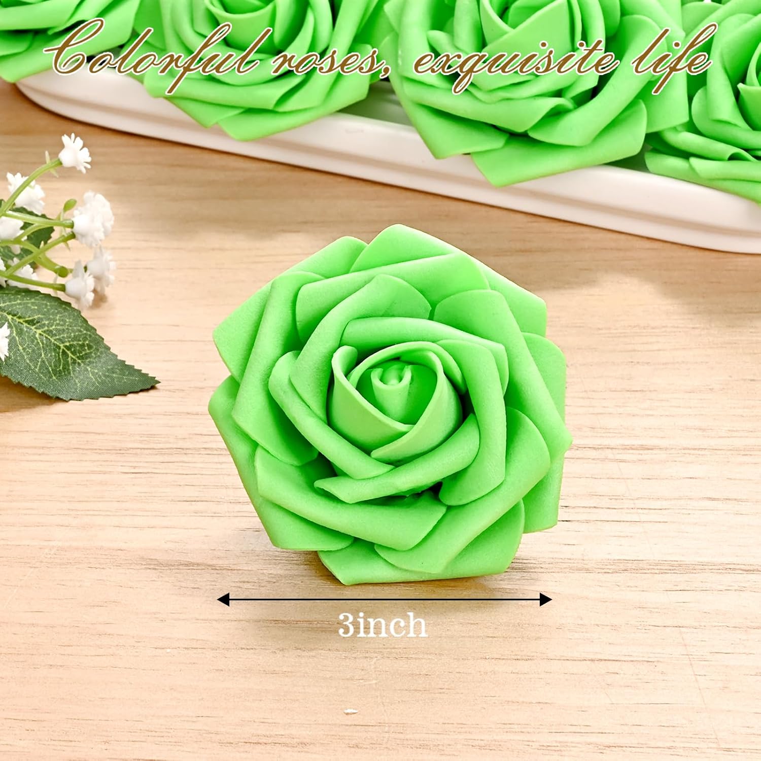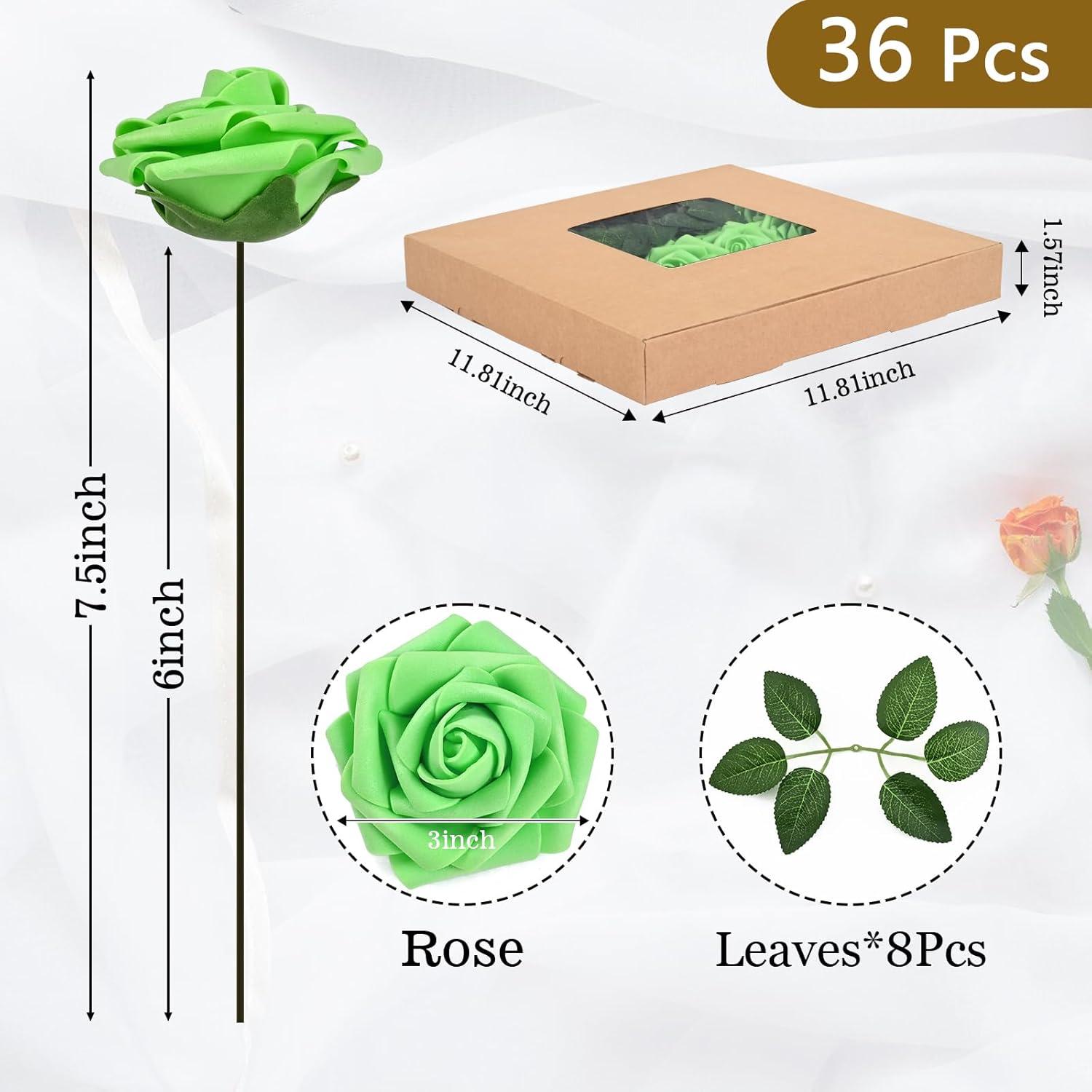 - Kindle Your Creative Flames: The box includes 36 bright green roses (3" flower head, 8" stem) and 8 green rose leaves, perfect for an array of DIY crafts. Whether creating wedding bouquets, graduation or birthday party ornaments, baby shower decorations, or cake adornments, our faux roses add a touch of class to every important moment.