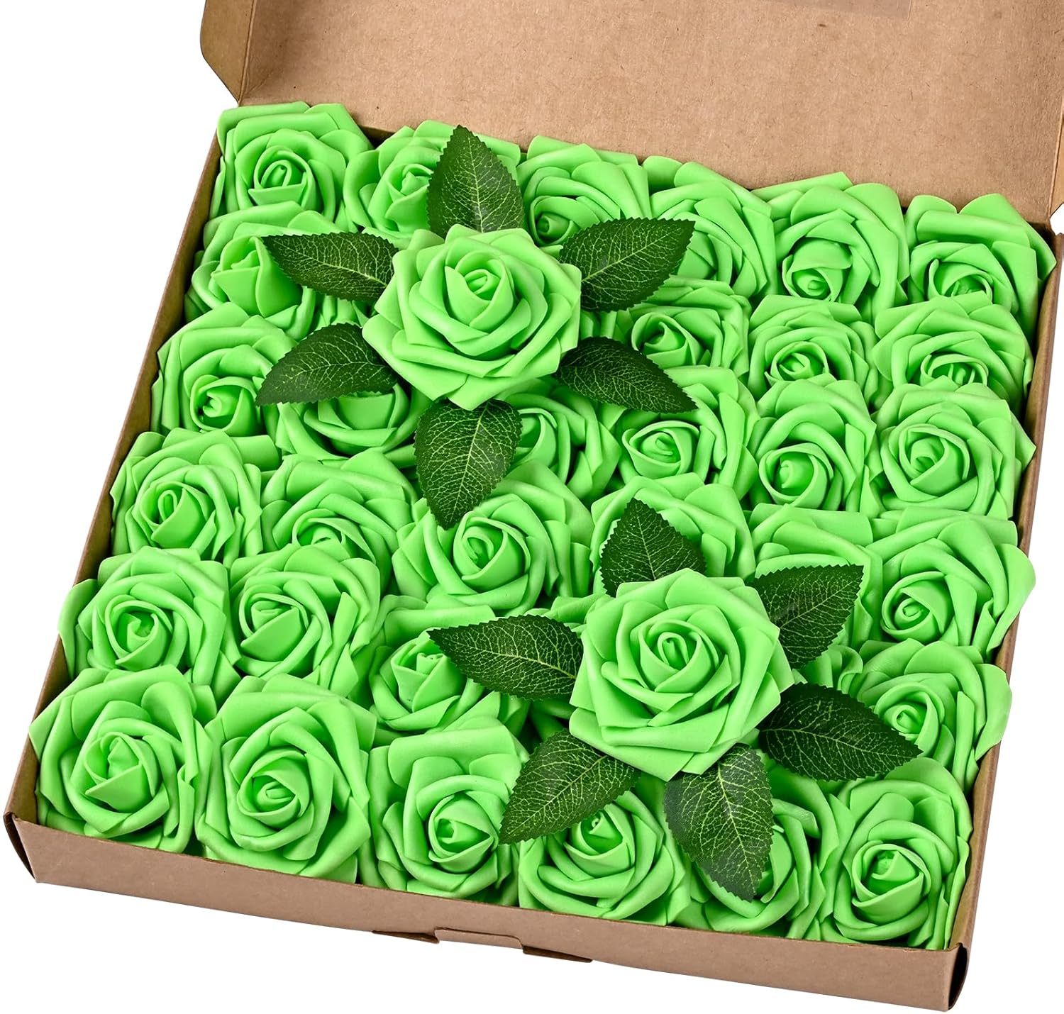 BLEUM CADE 36Pcs Artificial Flowers Fake Roses with Stems, Bright Green Boxed Foam Roses for DIY Bouquets Centerpieces Wedding Party Arrangement Bridal Shower Decor