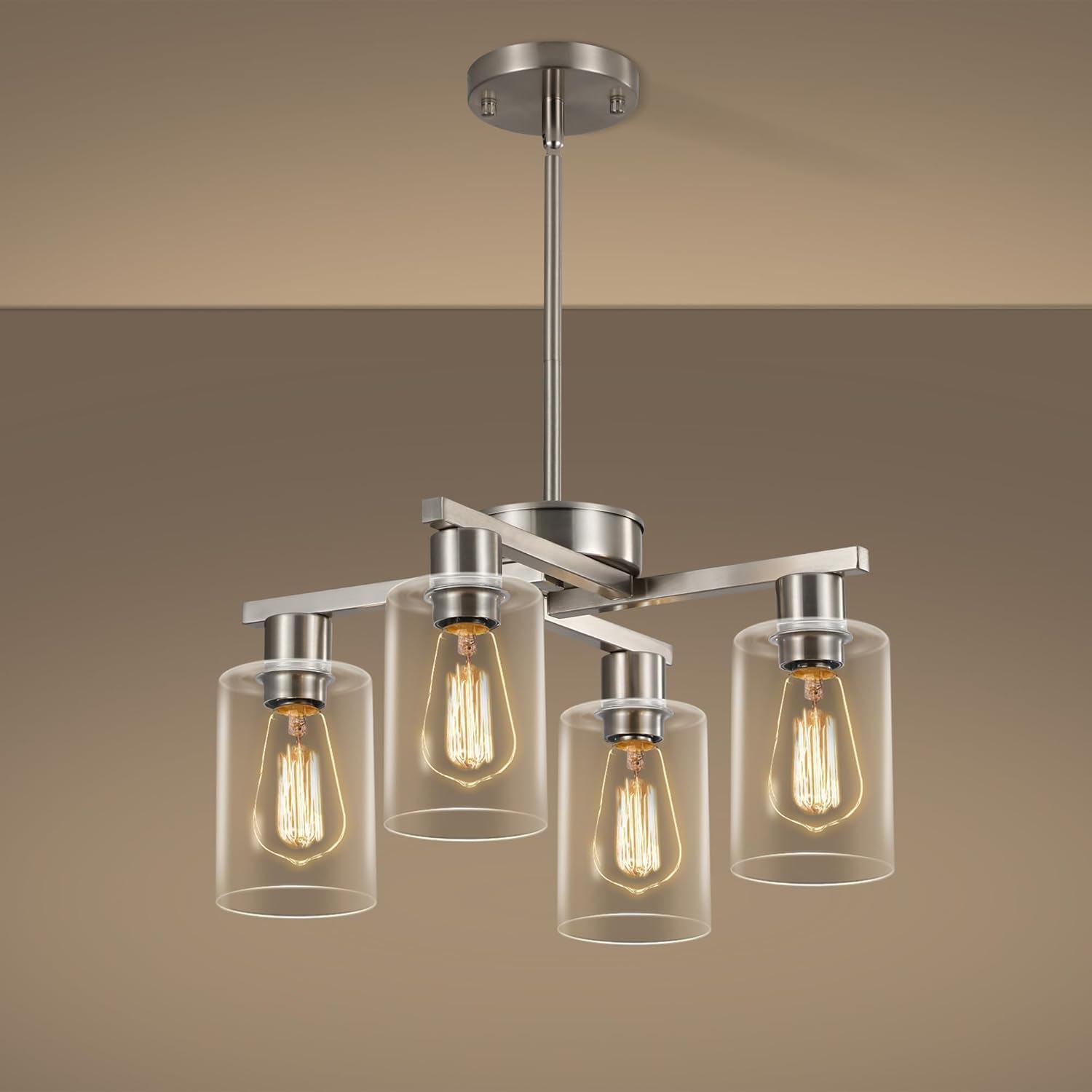 4-Light Modern Farmhouse Brushed Nickel Chandelier, Dining Room Light Fixture Over Table Adjustable Height Hanging Industrial Pendant Lights Kitchen Island, Clear Glass Shade