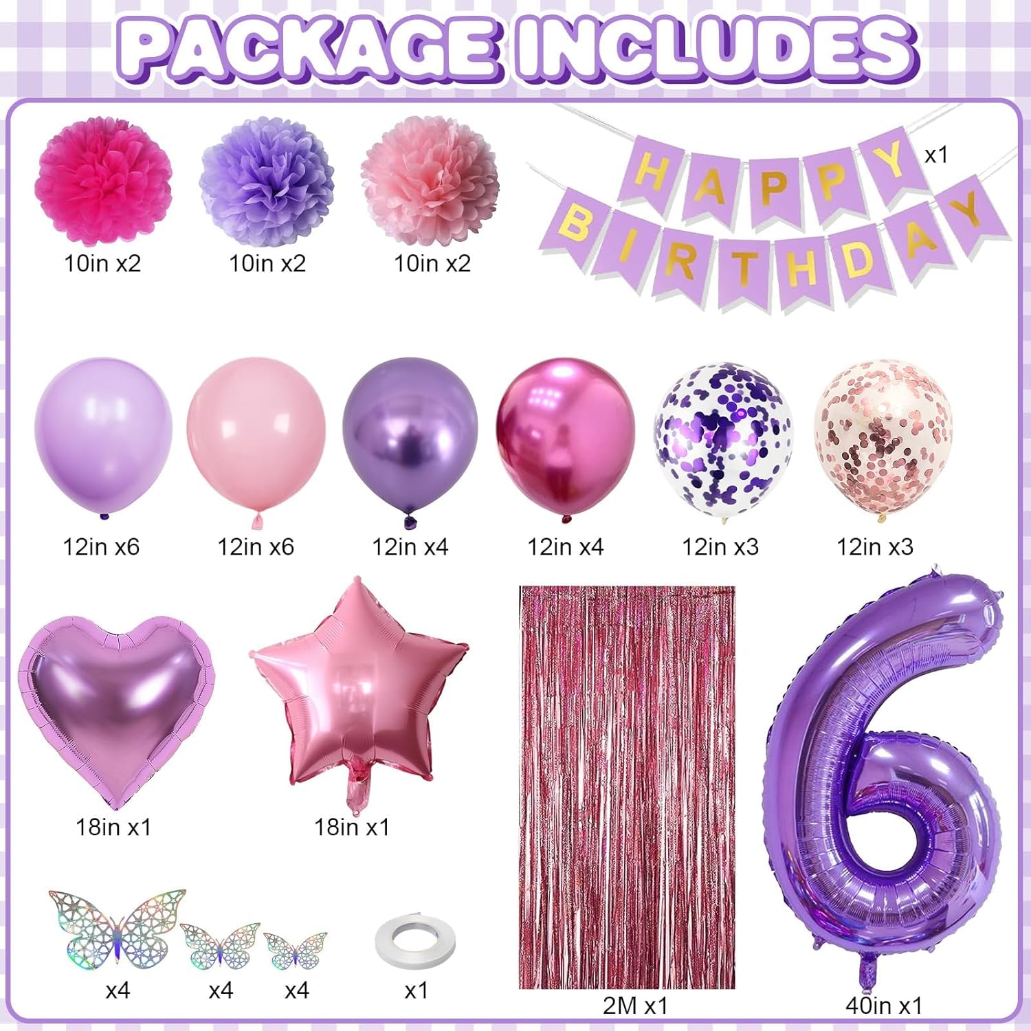 - PACKAGE INCLUDES: 1pc purple number 6 balloon, 1pc happy birthday banner, 2pcs light pink paper pom poms, 2pcs light purple paper pom poms, 2pcs hot pink paper pom poms, 1pc light pink fringe curtain, 1pc light pink star foil balloons, 1pc light purple heart foil balloons, 6pcs pastel purple balloons, 6pcs pastel pink balloons, 4pcs metallic purple balloons, 4pcs metallic magenta balloons, 3pcs purple confetti ballons, 3pcs pink confetti ballons, 1pc butterfly stickers set, 1pc ribbon