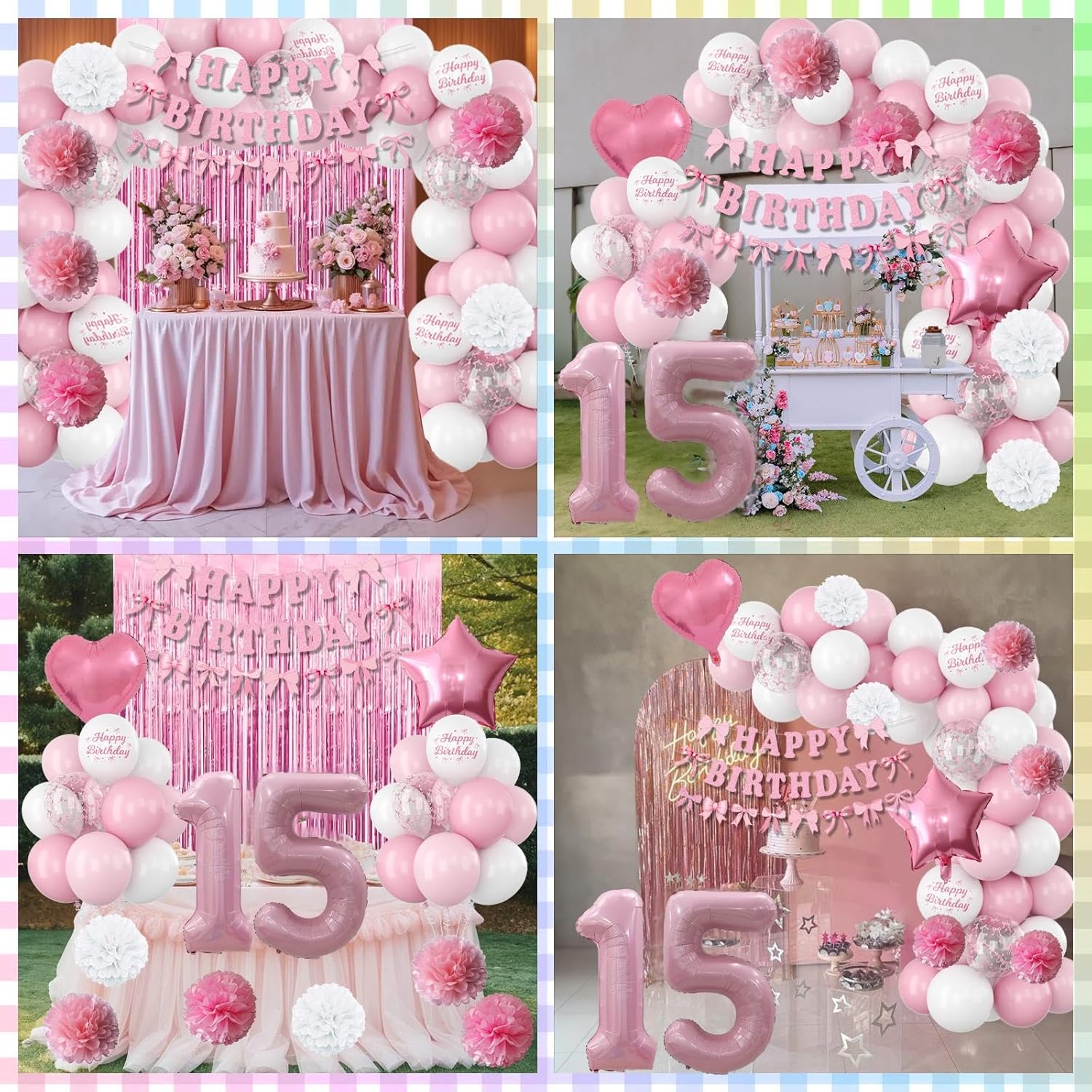 - PACKAGE INCLUDES: 1pc pearl pink number 15 balloon, 1pc bow happy birthday banner, 2pcs pink paper pom poms, 2pcs light pink paper pom poms, 2pcs white paper pom poms, 1pc pink curtain, 1pc light pink star foil balloons, 1pc light pink heart foil balloons,6pcs light pink balloons, 6pcs pastel pink balloons, 4pcs white balloons, 2pcs birthday printed balloons, 2pcs bow clear balloons, 1pc ribbon