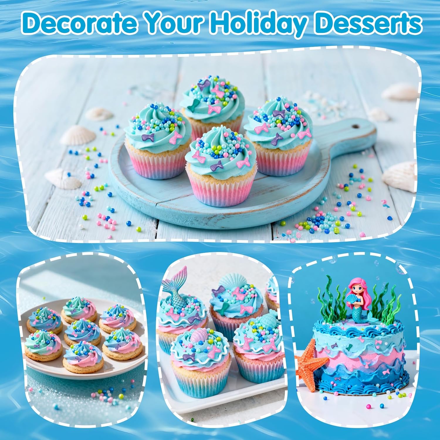 - Versatile Dessert Decoration: Our fun sprinkles includes Mermaid tails, Edible Pearl Sprinkles,colorful candy sprinkle.Perfect for meeting all your baking decoration needs.Dazzling and vibrant color combinations make your desserts look more lively and interesting.The sugar decorations are edibled candies. It is normal for large candies to have a hard texture and can be eaten with confidence.After baking, decorate the cookies or cake with pearl sugar to avoid melting