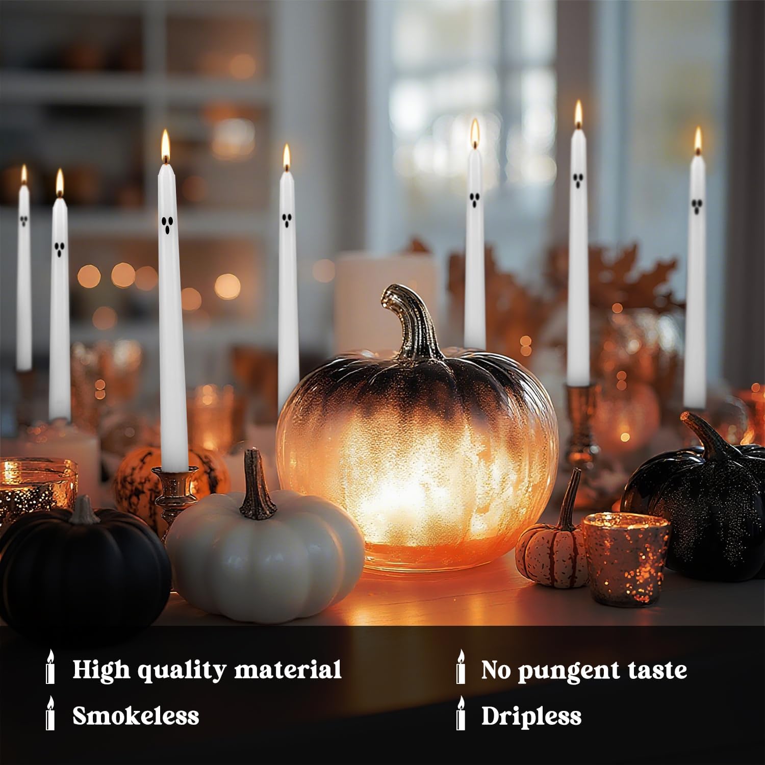 12 Pack Halloween Taper Candles - 10 Inch White Ghost Face Smokeless Candles, Long-Lasting 7+ Hour Burn, Premium Wax for Spooky Decor & Parties