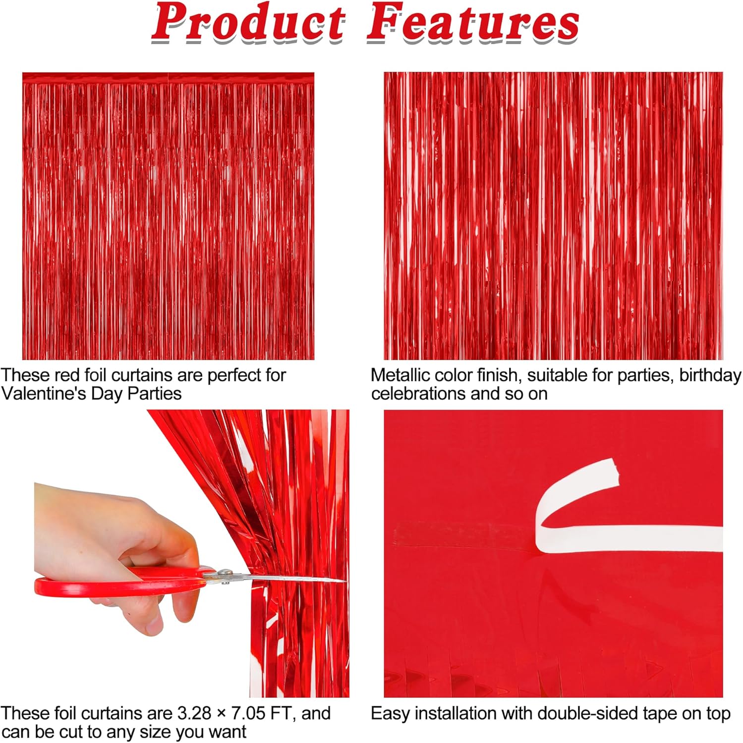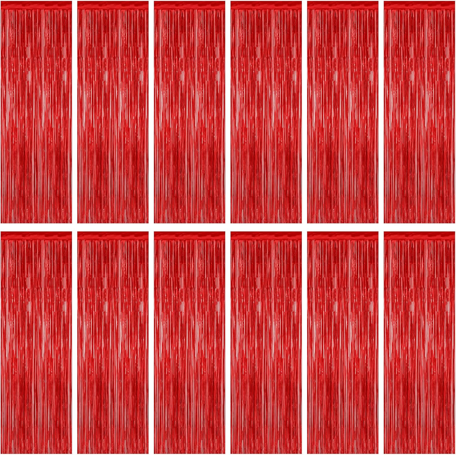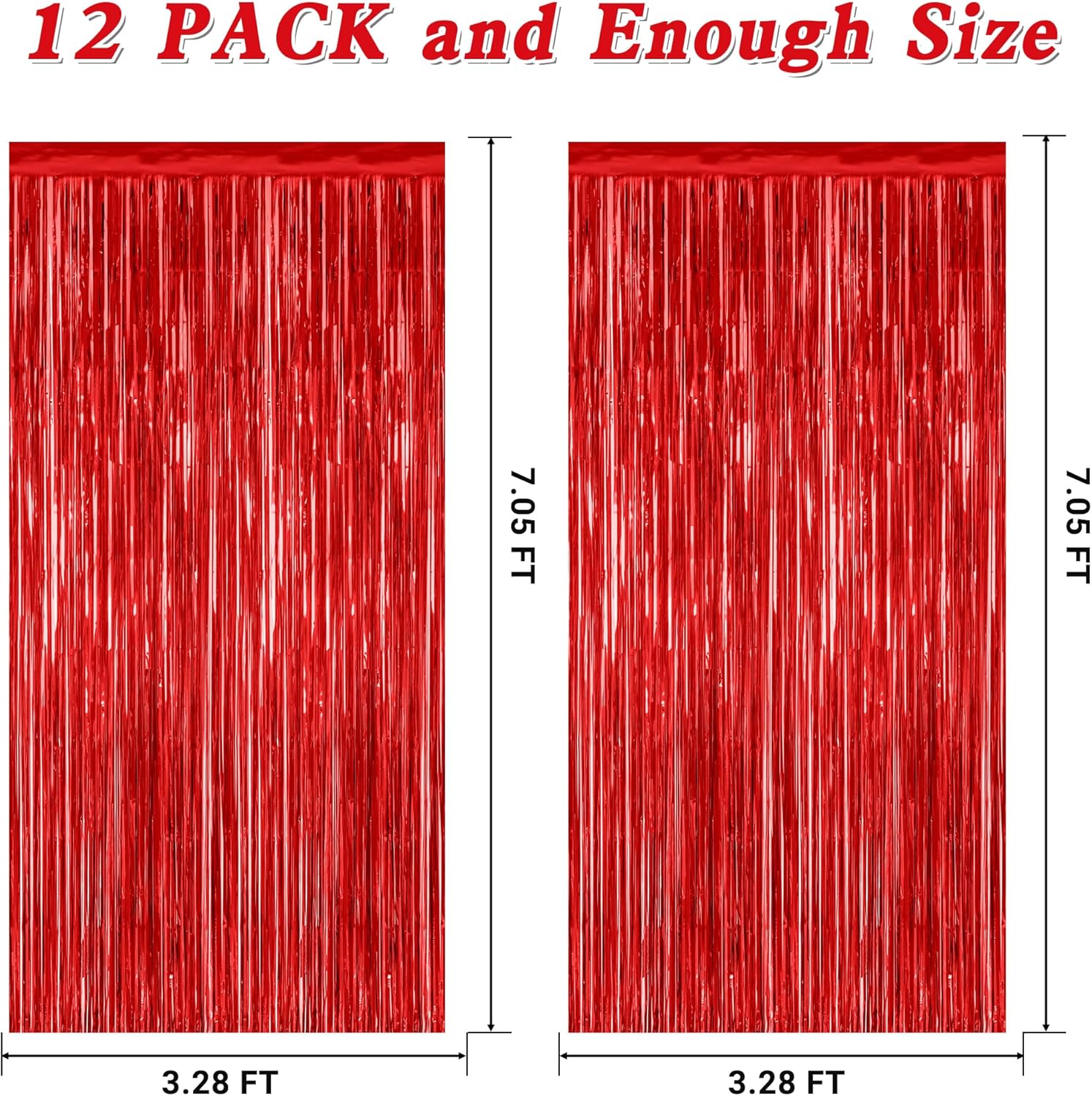 - Package Includes: The package includes 12 pcs red foil curtains, each with dimensions of 3.28 FT x 7.05 FT. These red foil fringe curtains can be trimmed to fit any specific area.