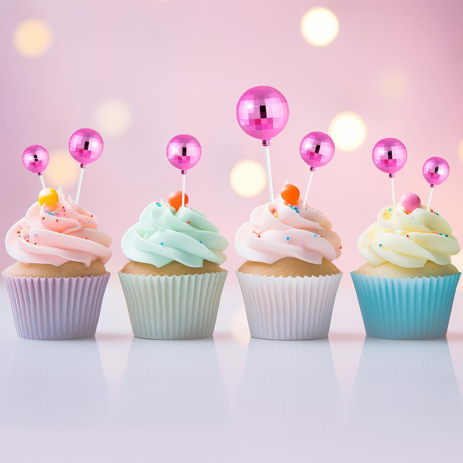 ASTARON 20 Pcs Disco Ball Cake Topper Decorations Sticks Pink Cake Balls Picks Toppers for Birthday Anniversary Disco Retired Theme Party Decorations