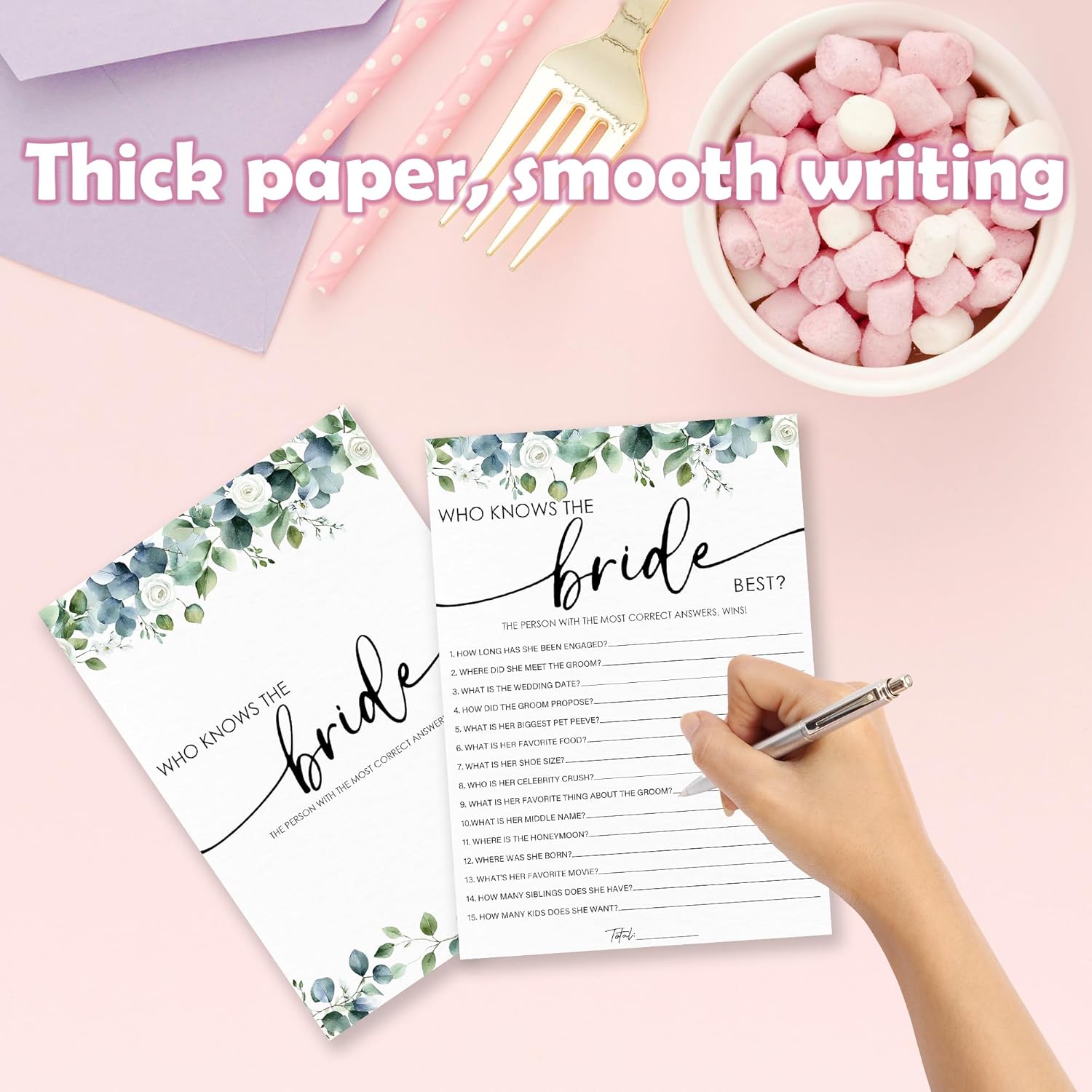 Who Knows The Bride Best - Botanical Bridal Shower Game Cards - 50 Pcs Eucalyptus Leaves Game Cards - Funny Wedding Party Games for Bride & Groom - Activities for Bachelorette Party - A01