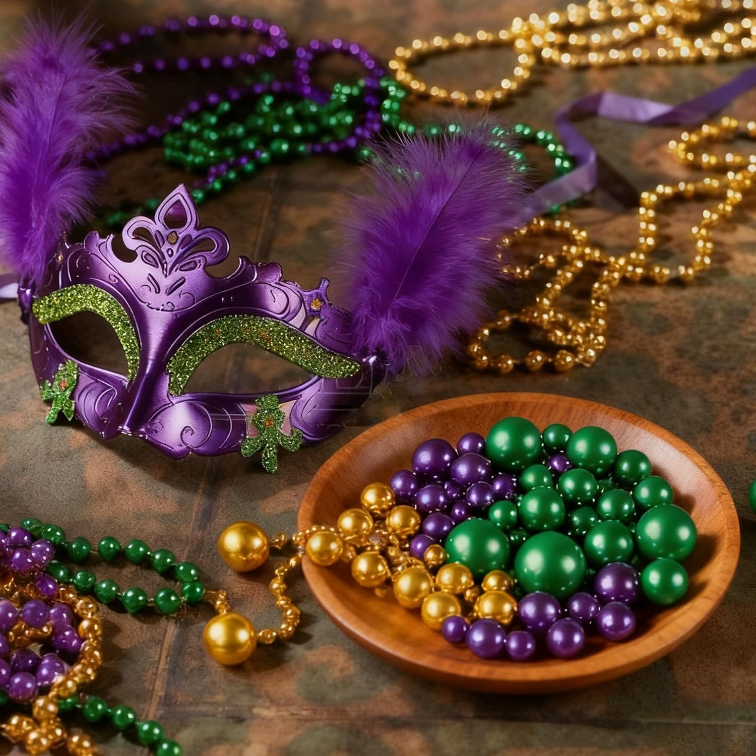 150Pcs Gold&Green&Dark Purple Polished Mardi Gras Beads for Vase Filling Decorations, Plastic Pearls Vase Fillers, Table Scatters, Mardi Gras Party, Home Decor, 8/14/20 mm