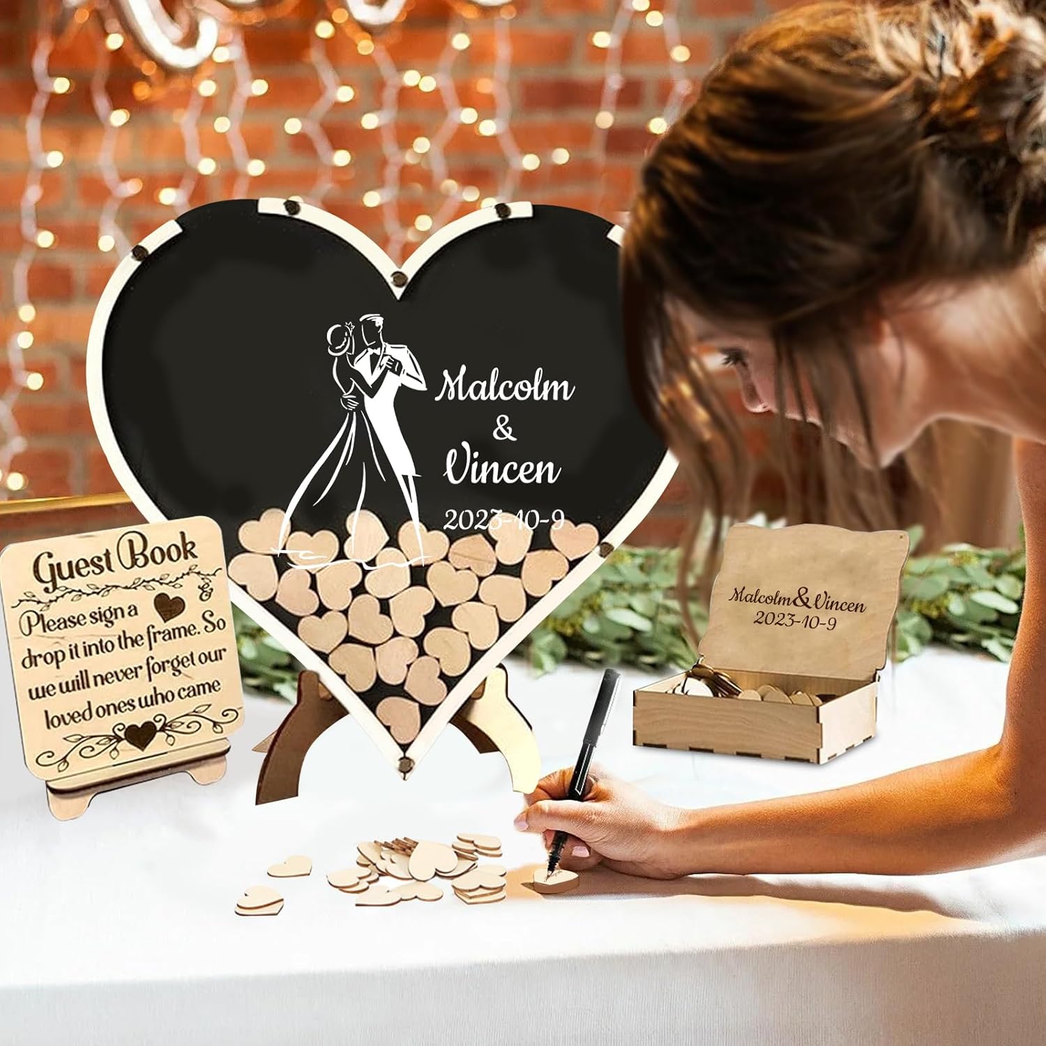 - Personalized Wedding Guest Book: This customizable wedding guest book allows for personalized names and dates. The couple can have their names and wedding date engraved on the book, transforming it into a special wedding keepsake. Guests write their names or well-wishes on heart-shaped wooden pieces before placing them inside the book. Each wooden piece carries the guest's heartfelt message, capturing a special moment from the couple's wedding day.