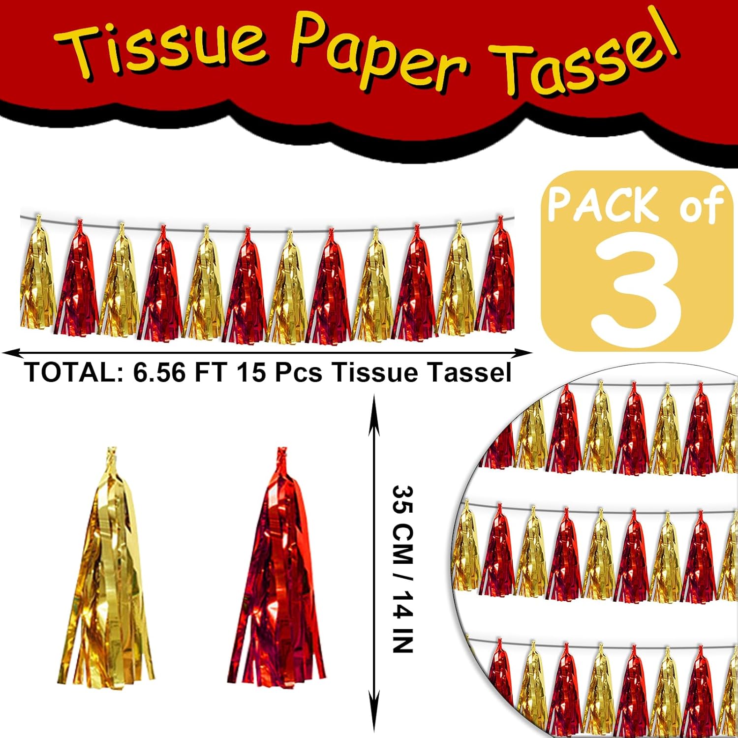 - 【Package Includes】The total length of the red gold birthday tassels banner is 30 feet, divided into 3 strips, each 10 feet long. Each banner contains 15 tassels, and each tassel measures 14 inches, for birthday decorations many occasions uitable for Patriotic display, omecoming Float, Christmas Float, ecorative metal trailers, graduation floats etc